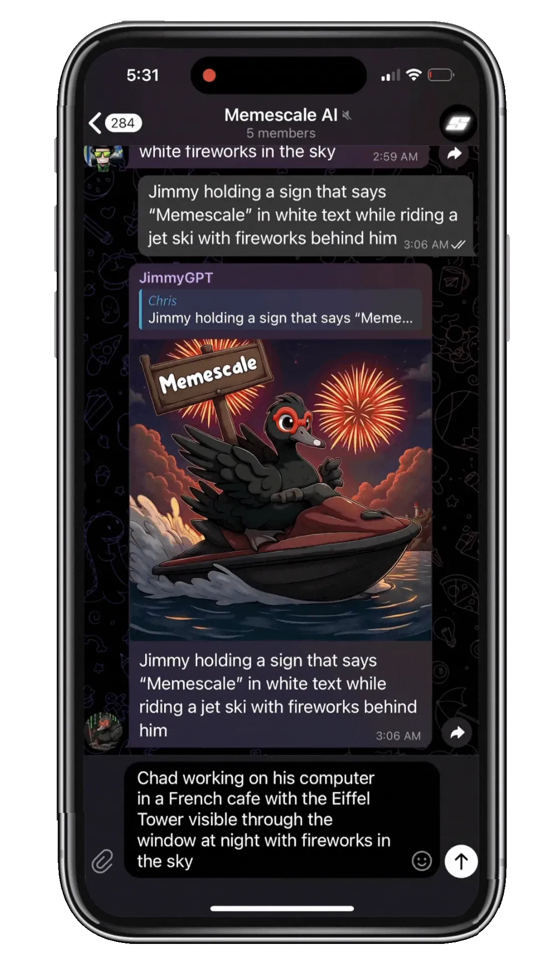 Community member types trigger followed by description. Bot queues, generates, delivers. Works in any group.
